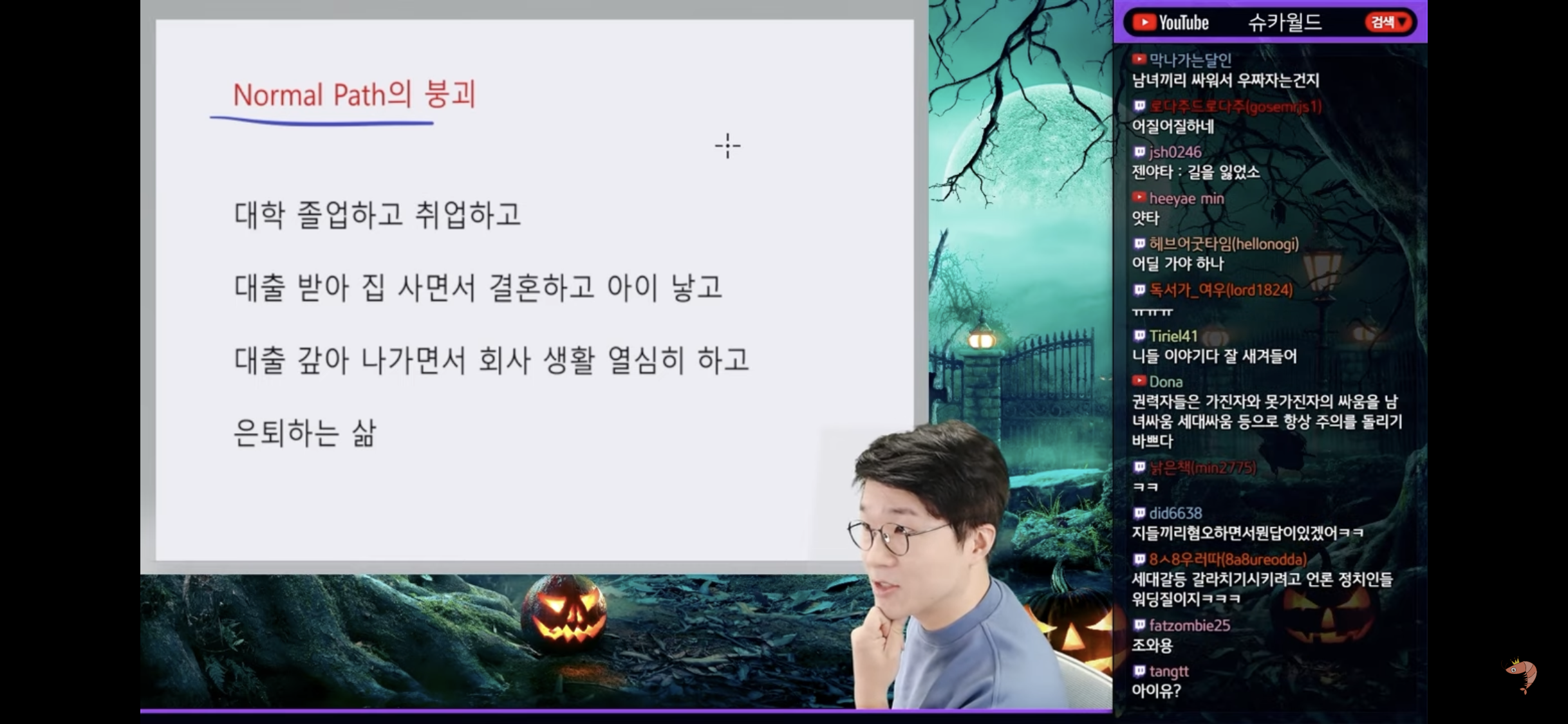 과거 좋은 회사에 들어가서, 결혼하고 대출받아서 집을 사고, 대출을 갚기 위해 열심히 일해 승진하고 은퇴하는 삶. 이런 Normal Path가 오늘날 붕괴했다는 것이다. 그 결과 나를 포함한 우리 사회의 젊은이들은 'N포 세대'가 되었고, 현재 우리 사회의 출산율, 결혼율은 처참하다.