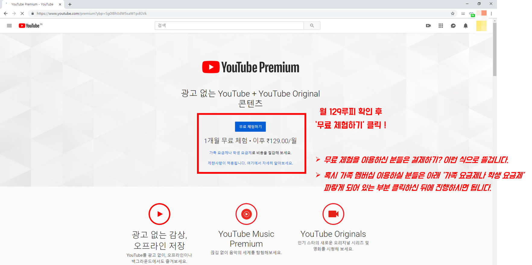 혹시 IN이 아니라 KR, 혹은 다른 국가로 표시되어도 꼭!! 유료 멤버십 결제에 들어가셔서 결제 금액이 '₹129'인지 확인해주세요!
