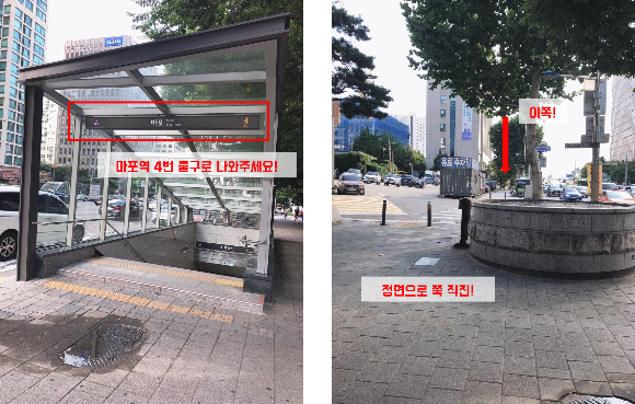 마포역 4번 출구로 나오시면 평균 걸음으로 한 7~8분 정도 걸리는 것 같습니다.
