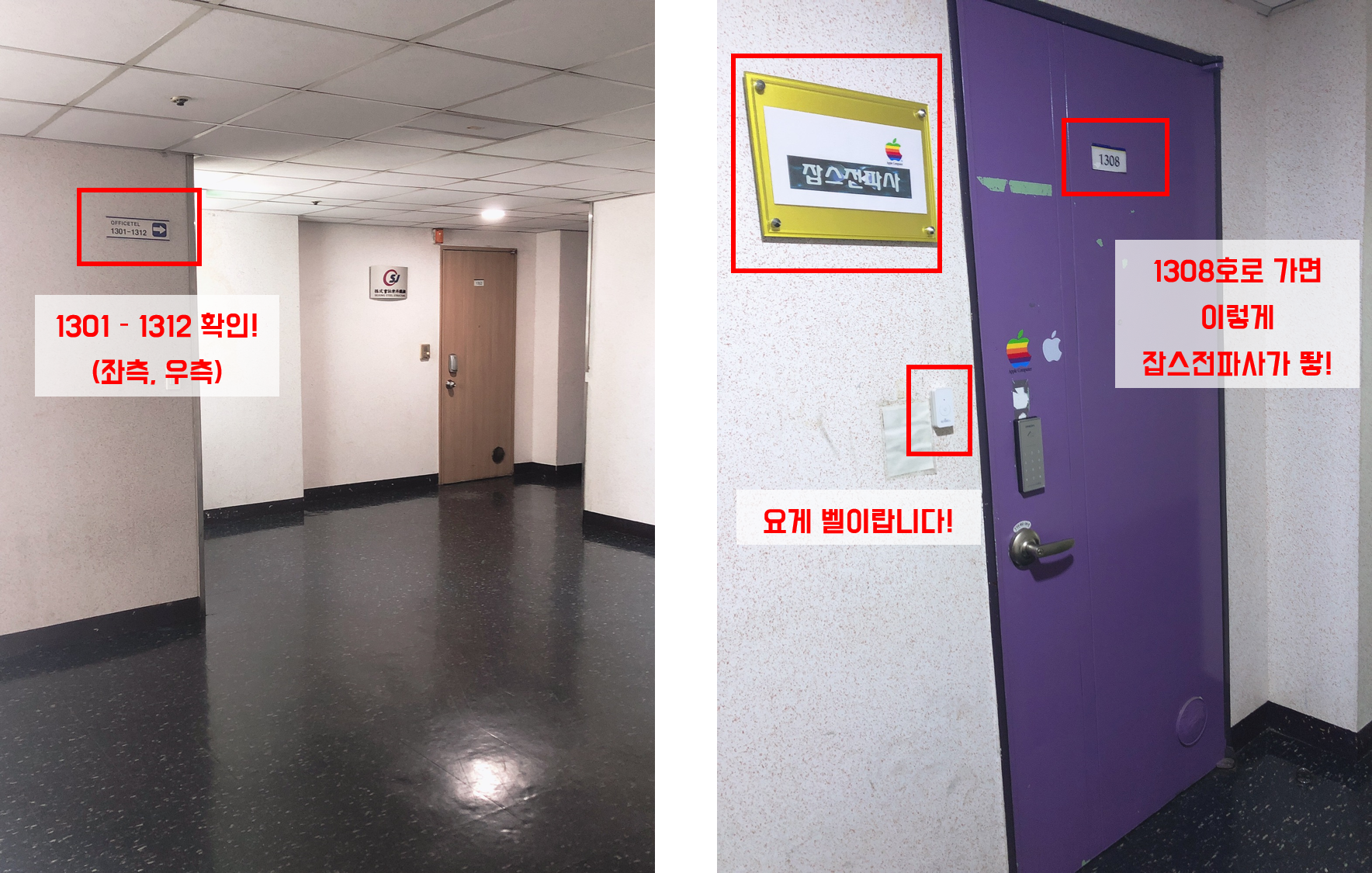 13층에서 내리면 양쪽으로 오피스텔이 있는데, 1301-1312 라인을 찾아줍니다.