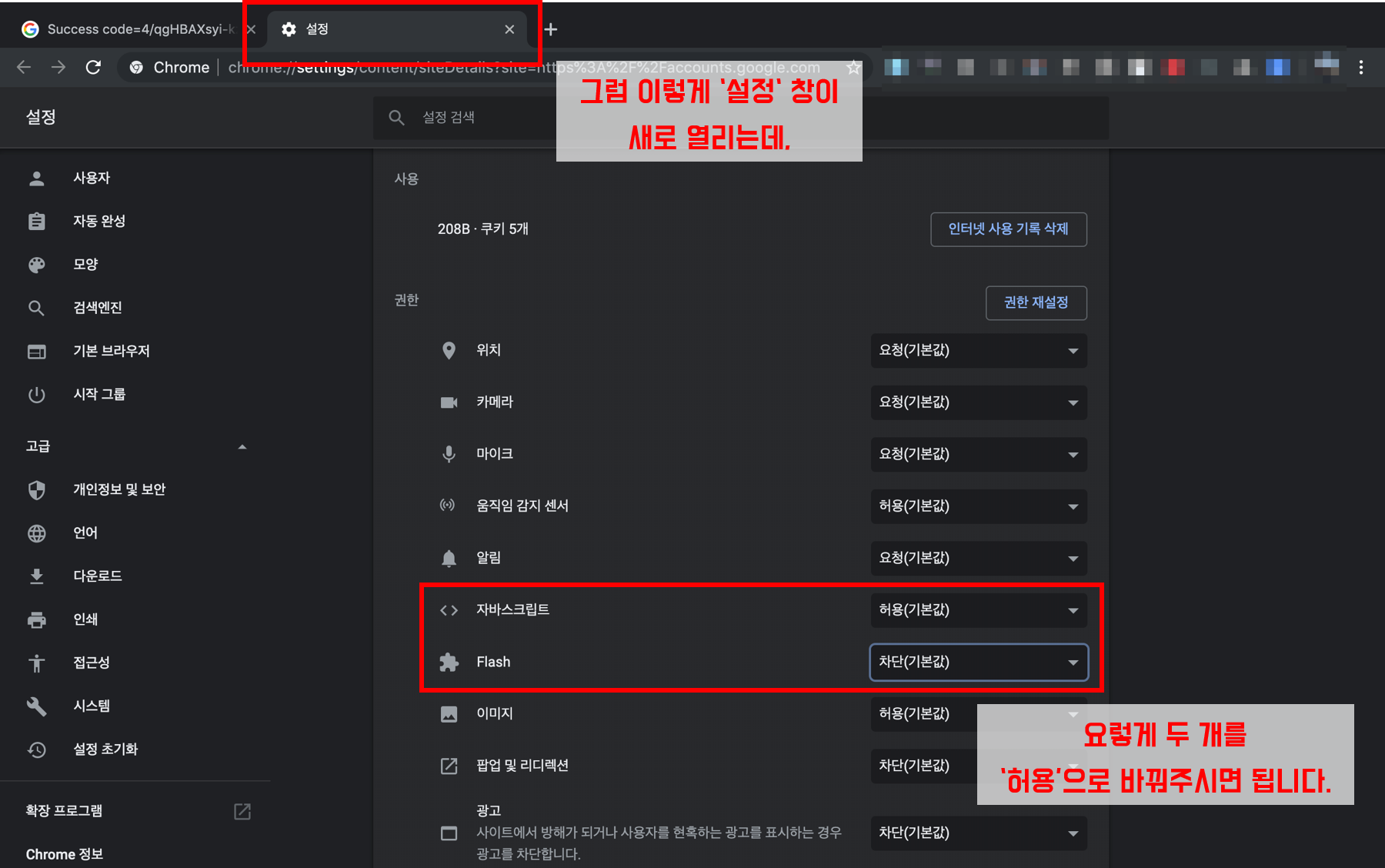 그 다음 '권한'에 있는 '자바스크립트'와 'Flash'를 '허용'으로 바꿔주시면 끝입니다.