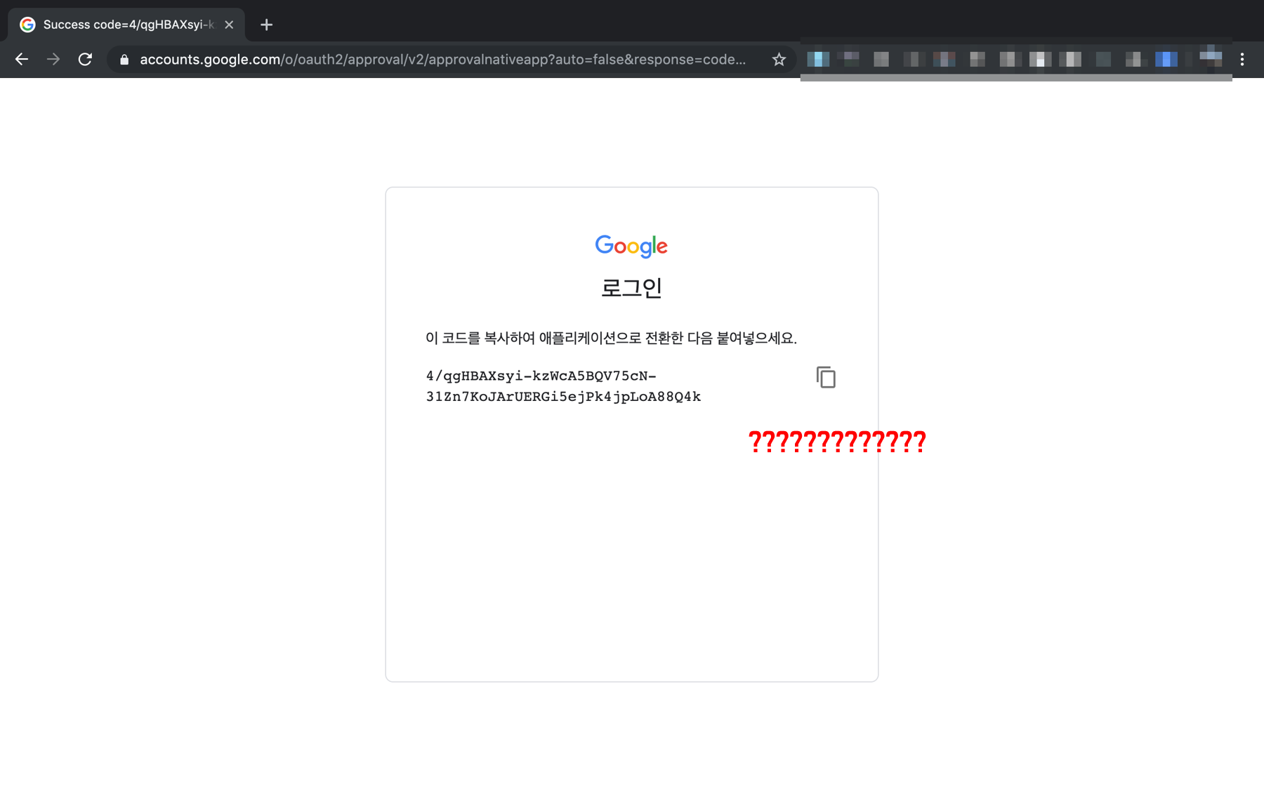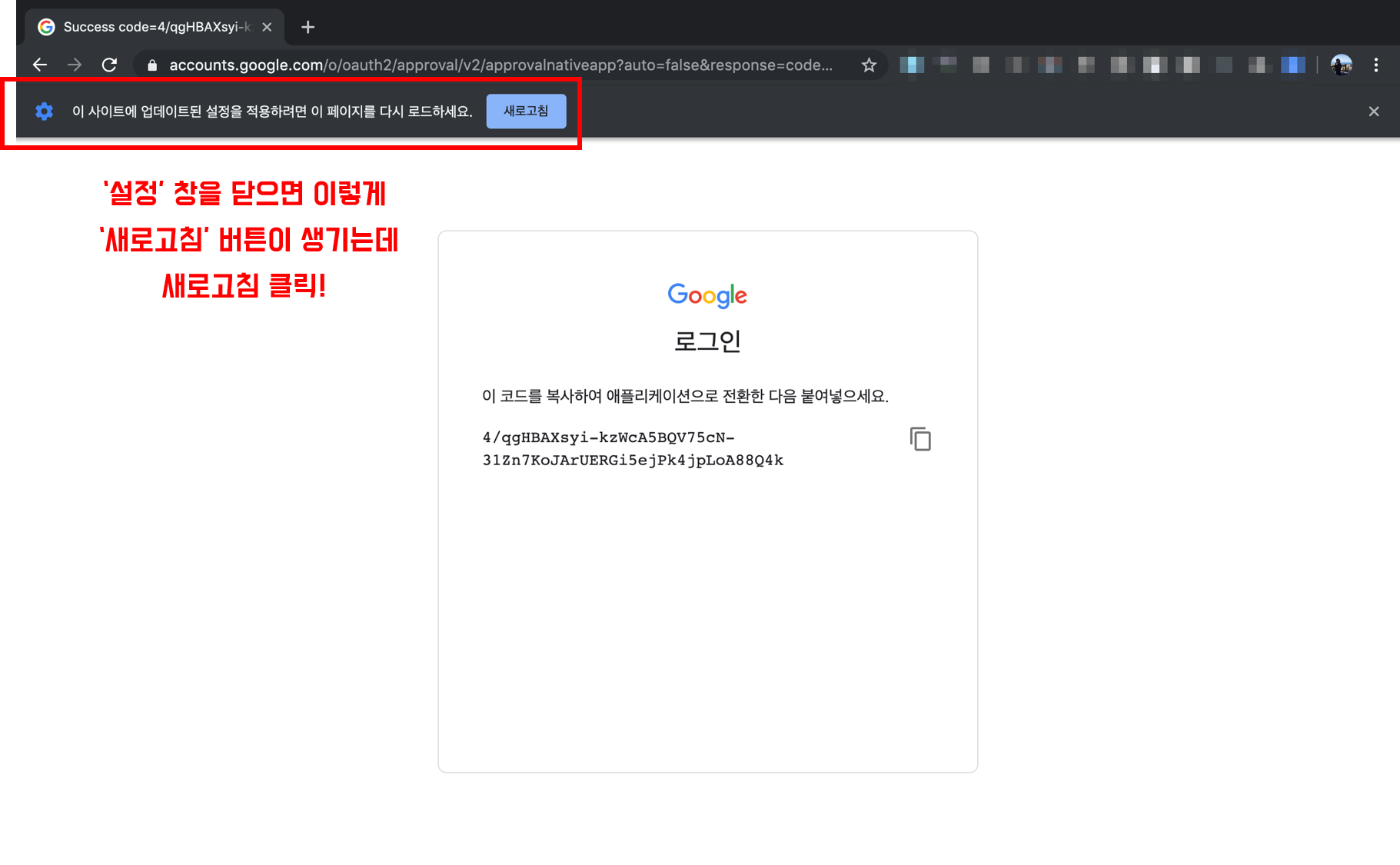 갑자기 이런 요상한 코드가 뜹니다 ㅋㅋㅋ 그리고 이 코드를 복사하여 애플리케이션으로 전환한 다음 붙여넣으라는 굉장히 불친절한 문구가 이어집니다.