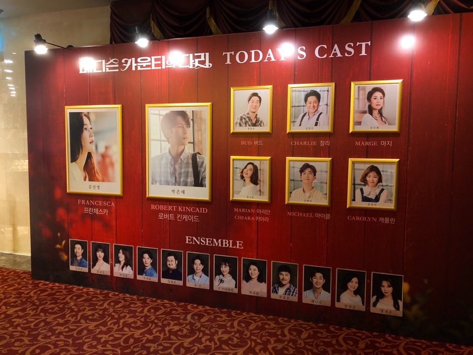 국내에서는 작년에 초연되었으며, 초연에는 로버트 킨케이드 역에 박은태 배우님, 프란체스카 역에 옥주현 배우님 원 캐스팅으로 충무아트홀에서 공연되었는데요! 따라서 올해 공연은 작년에 이은 국내 두 번째 공연입니다. 공연은 현재 잠실에 위치한 뮤지컬 전용 극장 '샤롯데시어터’에서 진행되고 있습니다.